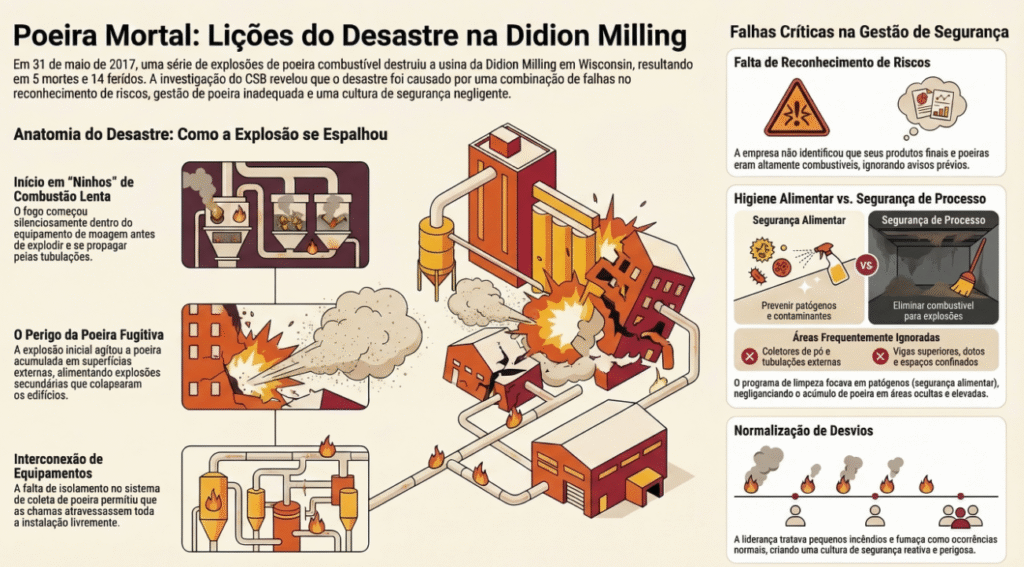 No dia 31 de maio de 2017, a instalação de moagem de milho seco da Didion Milling, localizada em Cambria, Wisconsin (EUA), foi palco de uma tragédia que resultou em 5 fatalidades, 14 feridos e na destruição quase total da planta. A investigação conduzida pelo US Chemical Safety Board (CSB) revelou falhas críticas de design, gestão e cultura de segurança.