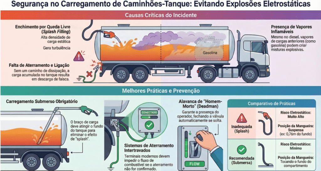 O acidente ocorreu enquanto um motorista inseria uma mangueira flexível para carregar diesel em um compartimento do caminhão-tanque. A falha crítica: a mangueira não se estendia até o fundo do tanque, ficando a aproximadamente 0,76 metros do piso.